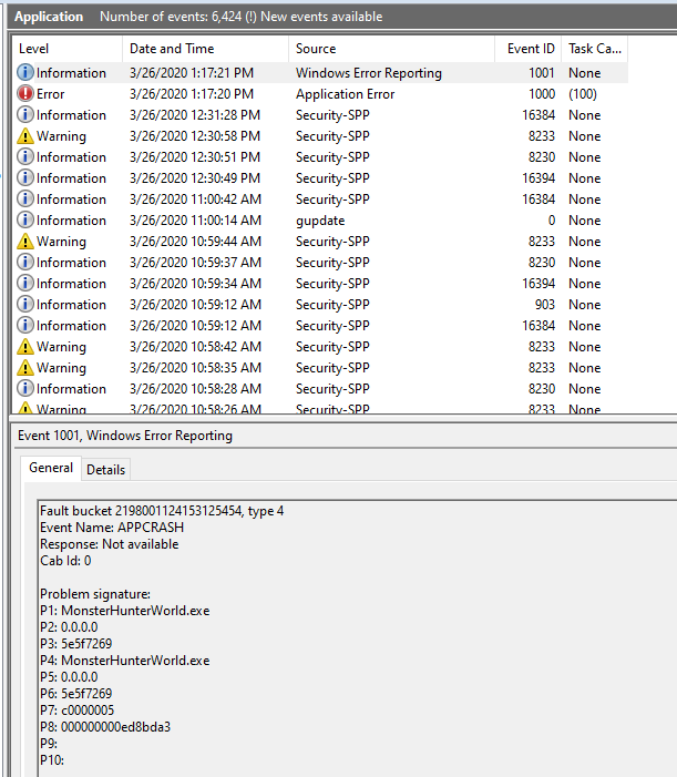 이벤트 로그를 먼저 확인해보니 APPCRASH