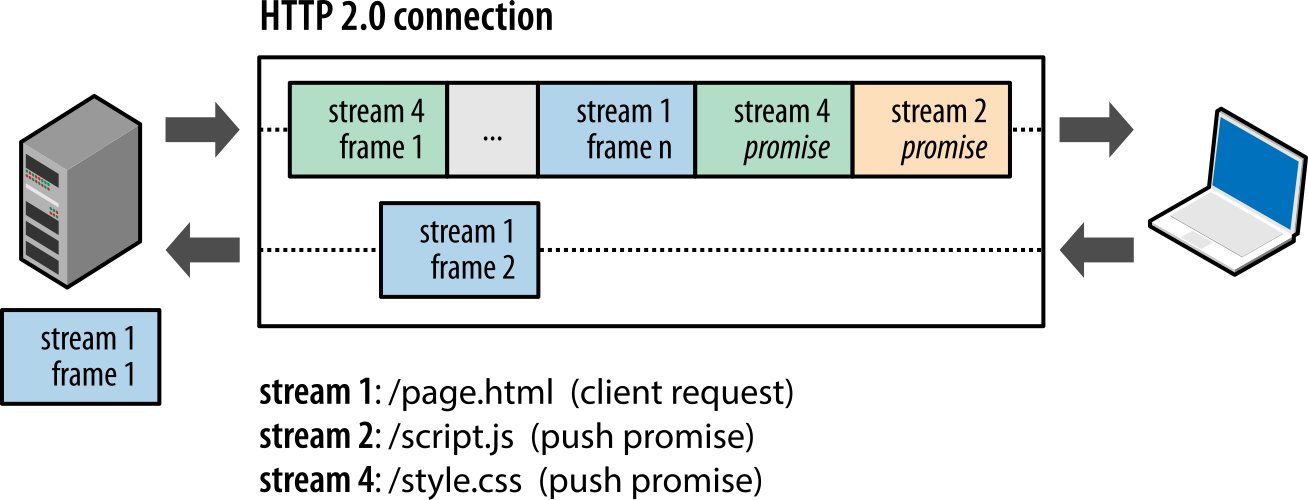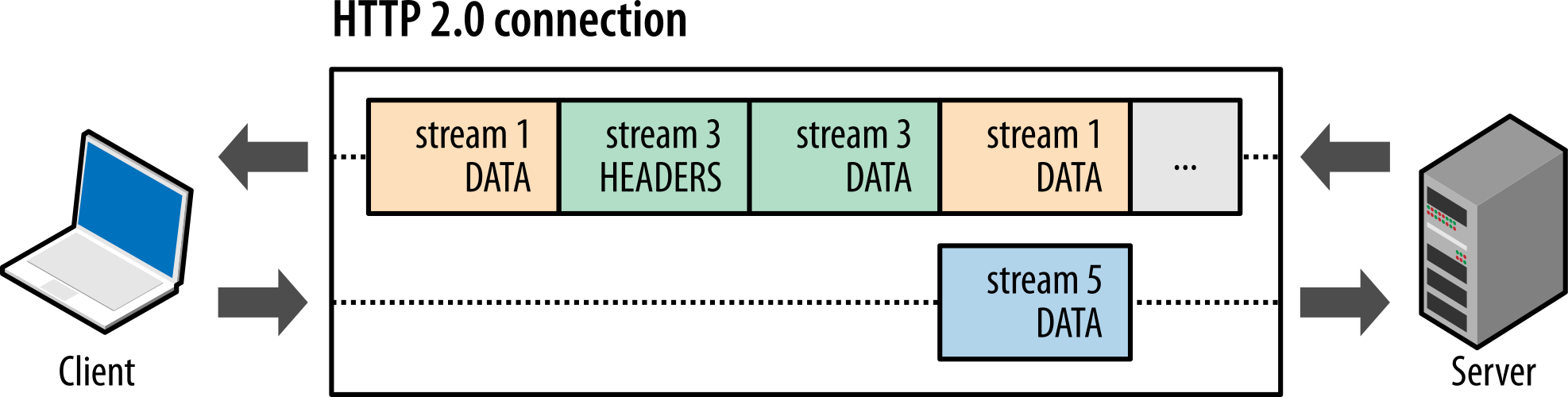 여기서 주의해야 할 사항은 클라이언트가 어느 리소스부터 응답받고 싶은지를 스트림의 우선순위와 종속 관계로 표현할 수는 있지만, 서버가 어떻게 반응할지는 서버 마음대로 라는 점입니다. 즉 클라이언트는 서버의 응답 순서를 강제할 수 없고, 어느 리소스부터 응답받을지는 보장할 수 없습니다. 왜냐하면 요청한 리소스를 처리하는데 얼마나 걸리는지를 판단할 수 있는건 클라이언트가 아니라 서버이기 때문에 우선순위가 높은 리소스를 처리하는데 시간이 오래걸린다면, 우선순위가 낮은 리소스라도 응답해야 성능상 유리하기 때문입니다.