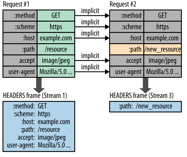 헤더 압축 기능은 이름 그대로 HTTP 헤더를 압축하는 기능입니다. 먼저 각 HTTP 헤더 필드를 Huffman 코드로 인코딩하여 전송 크기를 줄입니다. 그리고 클라이언트와 서버 양쪽에서 HTTP 헤더에 대한 기록을 유지해서 이전에 전송한 프레임에서 동일하게 사용하는 헤더는 전송하지 않습니다. 즉 프레임 간 동일한 헤더를 중복해서 전송하지 않아 성능을 개선합니다. 헤더 압축은 HPACK 알고리즘으로 구현되었습니다.