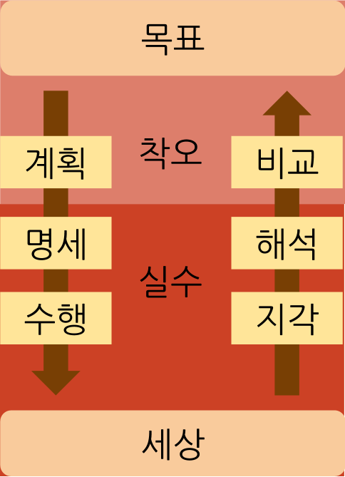 착오는 목표나 계획을 세우고, 결과를 기대와 비교하는 고등 수준의 인지에서 생기는 오류다. 그래서 착오는 의식적인 심사숙고의 결과다. 실수는 계획의 실행이나 결과의 지각 또는 해석에서 발생한다. 그래서 실수는 잠재의식적인 행위의 결과다.