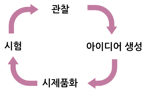 인간 중심 디자인은 다음 네가지 활동이 순환되며 각 주기가 반복될수록 통찰을 낳고, 바라는 해결책으로 더 가까이 간다. 잠재 고객 집단을 관찰하고, 아이디어를 생성하고, 시제품을 만들고, 시험하라.